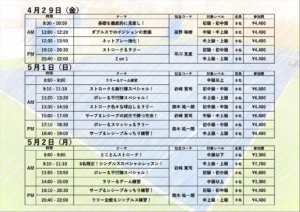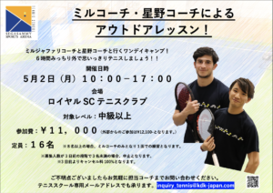 また、5月1日と2日は千葉県にあります「ロイヤルSCテニスクラブ」にてアウトドアレッスンを行います!